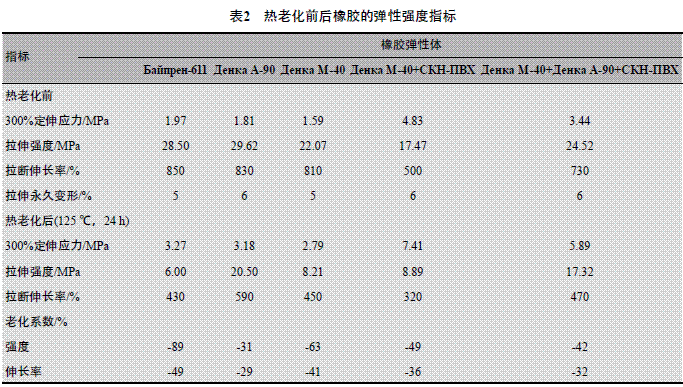 為制造可在高溫下使用的制品,應(yīng)該使用耐熱性相當(dāng)高的膠粘劑。眾所周知,硫醇調(diào)節(jié)型氯丁橡膠屬于耐熱性橡膠。為了研制能在90~125 ℃高溫條件下長期工作的膠布制品用膠粘劑,對(duì)Байпрен-611、Денка М-40和Денка А-90氯丁橡膠(硫醇調(diào)節(jié)型,高結(jié)晶速度)的耐高溫性能進(jìn)行了試驗(yàn)。試驗(yàn)結(jié)果表明,在耐熱老化性方面,Байтрен-611氯丁橡膠比硫醇調(diào)節(jié)型氯丁橡膠Денка А-90和聚合物分子鏈結(jié)構(gòu)規(guī)整性較好的Денка М-40差得多(見表2)。由于Денка А-90橡膠的結(jié)晶度高,以它為基礎(chǔ)的粘合膠料在溶劑中不易溶解,但是,使用含有CKH-26-ПВХ的粘合膠料,在保持其相當(dāng)高的耐熱老化性的前提下,即可彌補(bǔ)這一不足之處。