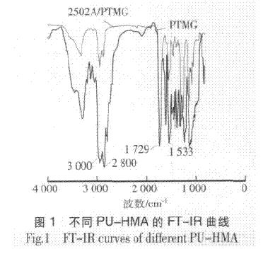 由圖1 可知:1 729、1 533cm-1 處是-NH-COO-的特征吸收峰;PTMG/MDI 制成的PU-HMA 之-CH2特征吸收峰(2 800~3 000 cm-1)明顯增強(qiáng),說(shuō)明其柔性更好(即軟化點(diǎn)和粘接強(qiáng)度更低)。