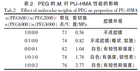 在其他條件保持不變的前提下, 不同PEG 的Mr對(duì)PU-HMA 性能的影響如表2 所示。