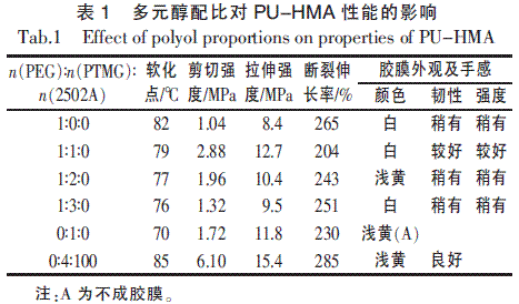 PEG 和PTMG 的分子結(jié)構(gòu)規(guī)整,易于結(jié)晶[5],而結(jié)晶可有效增加HMA 的內(nèi)聚力和粘接力;然而,結(jié)晶速率過(guò)快或結(jié)晶度過(guò)高時(shí),體系瞬時(shí)黏附性相對(duì)較差。因此,將不同結(jié)晶速率的聚酯多元醇、聚醚多元醇按一定比例混合,可破壞體系的分子結(jié)構(gòu)規(guī)整性,調(diào)整體系的結(jié)晶速率,并且可有效克服體系因結(jié)晶過(guò)快而導(dǎo)致的內(nèi)應(yīng)力等弊病。2502A 屬于芳香族聚酯多元醇(含苯環(huán)結(jié)構(gòu)),可賦予相應(yīng)PU-HMA更高的粘接強(qiáng)度。綜合考慮膠粘劑的強(qiáng)度、軟化點(diǎn)和柔韌性等因素, 本研究選擇PEG、PTMG 和2502A 作為多元醇,并在其他條件保持不變的前提下[R=n(-NCO)/n(-OH)=1.03],考察了多元醇配比對(duì)PU-HMA性能的影響,結(jié)果如表1 所示。