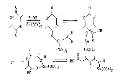 聚丙交酯又稱聚乳酸,是一種熱塑性聚合物,它在濕氣中無(wú)光照條件下即可發(fā)生水解,在微生物和酶作用下進(jìn)一步分解為CO2和H2O,是一種環(huán)境友好材料。也是目前可生物降解熱熔膠中研究多的一種材料。聚丙交酯的原料為乳酸(二羥基丙酸)。乳酸分子結(jié)構(gòu)式中同時(shí)含有羥基和羧基,反應(yīng)活性較高,適當(dāng)條件下可脫水形成PLA,PLA的合成主要有直接縮聚和丙交酯開(kāi)環(huán)聚合兩種方式,開(kāi)環(huán)聚合工藝為: